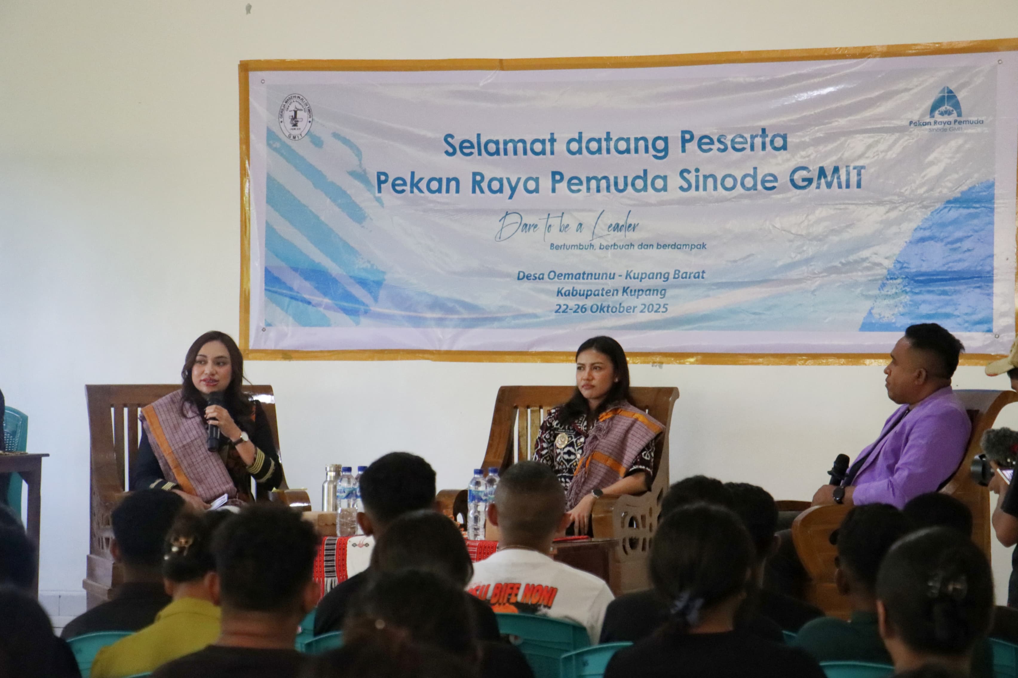 Wakil Wali Kota Kupang, Serena C. Francis, S.Sos., M.Sc., bersama Wakil Bupati Kupang, Aurum Obe Titu Eki, S.Ars., M.Ars., menjadi narasumber dalam kegiatan Bincang-Bincang Orang Muda yang digelar dalam rangka Pekan Raya Pemuda Sinode GMIT di Bumi Perkemahan CHMK Oematnunu, Kupang Barat, Kabupaten Kupang, Kamis (23/10).