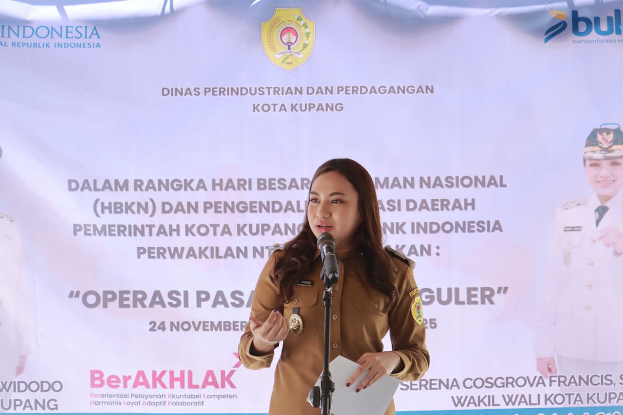 Wakil Wali Kota Kupang, Serena Cosgrova Francis, S.Sos., M.Sc., meresmikan pelaksanaan Pasar Murah Reguler Tahun 2025 yang digelar Dinas Perindustrian dan Perdagangan Kota Kupang, Senin (24/11) di halaman Kantor Camat Kota Raja.
