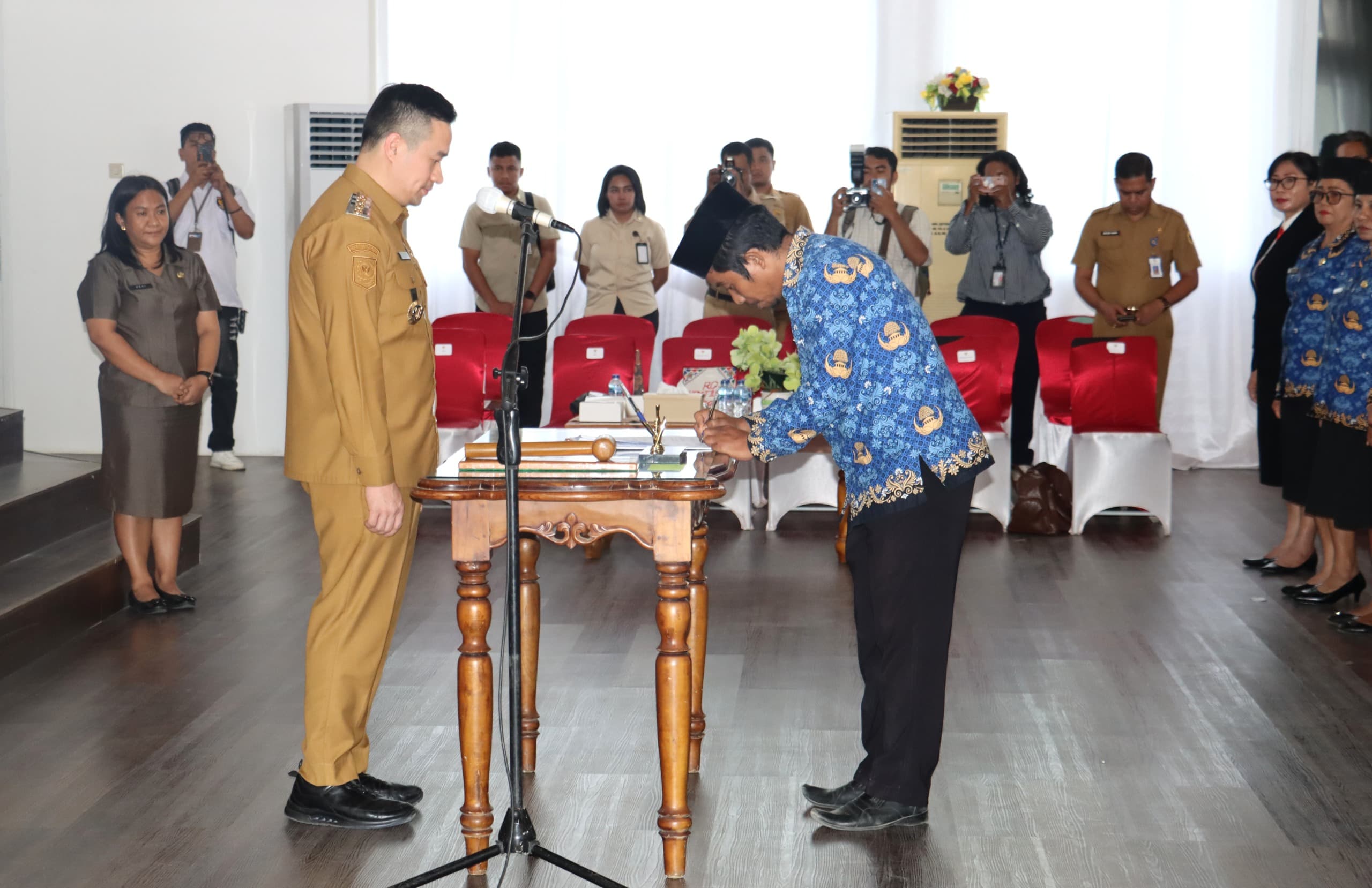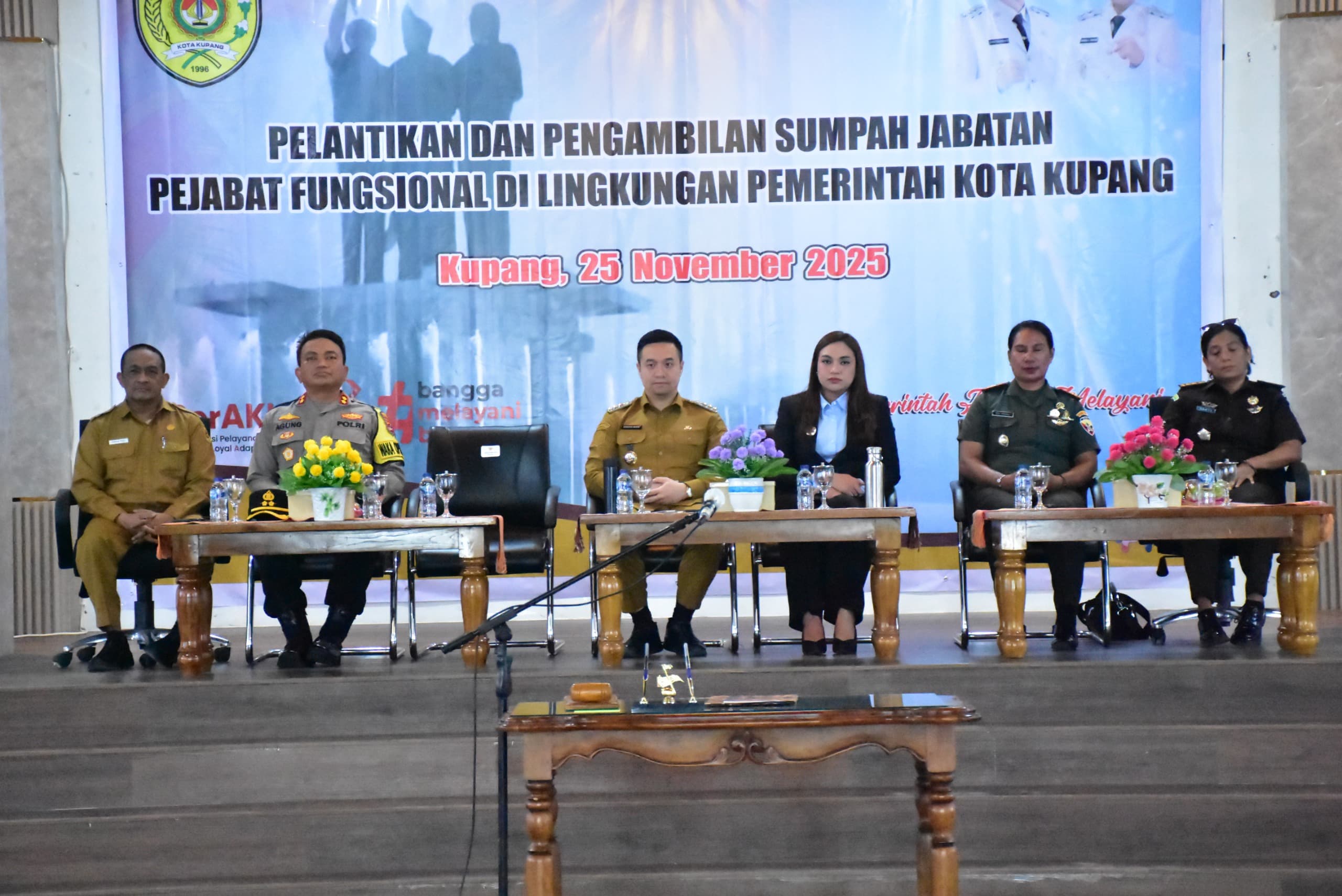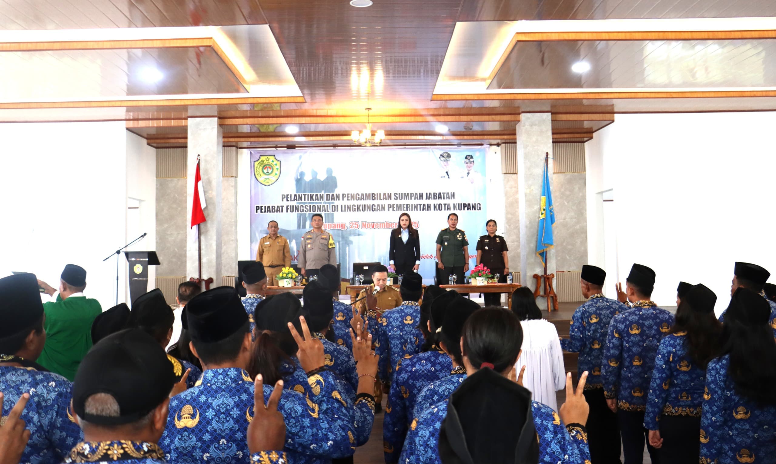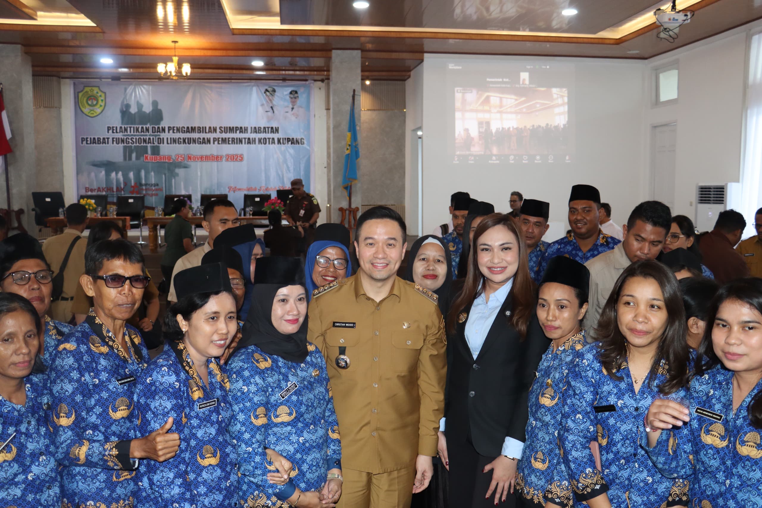 Wali Kota Kupang, dr. Christian Widodo, melantik 80 Pejabat Fungsional di lingkup Pemerintah Kota Kupang dalam sebuah upacara resmi yang berlangsung di Aula Rumah Jabatan Wali Kota, Selasa (25/11). Turut hadir Wakil Wali Kota Kupang, Serena C. Francis, S.Sos., M.Sc., unsur Forkopimda Kota Kupang, Sekretaris Daerah Kota Kupang, Jeffry E. Pelt, S.H., para Asisten Sekda Kota Kupang, para Kepala Perangkat Daerah lingkup Kota Kupang, Camat, para tokoh agama yang mengambil sumpah, serta 80 pejabat fungsional yang dilantik.
