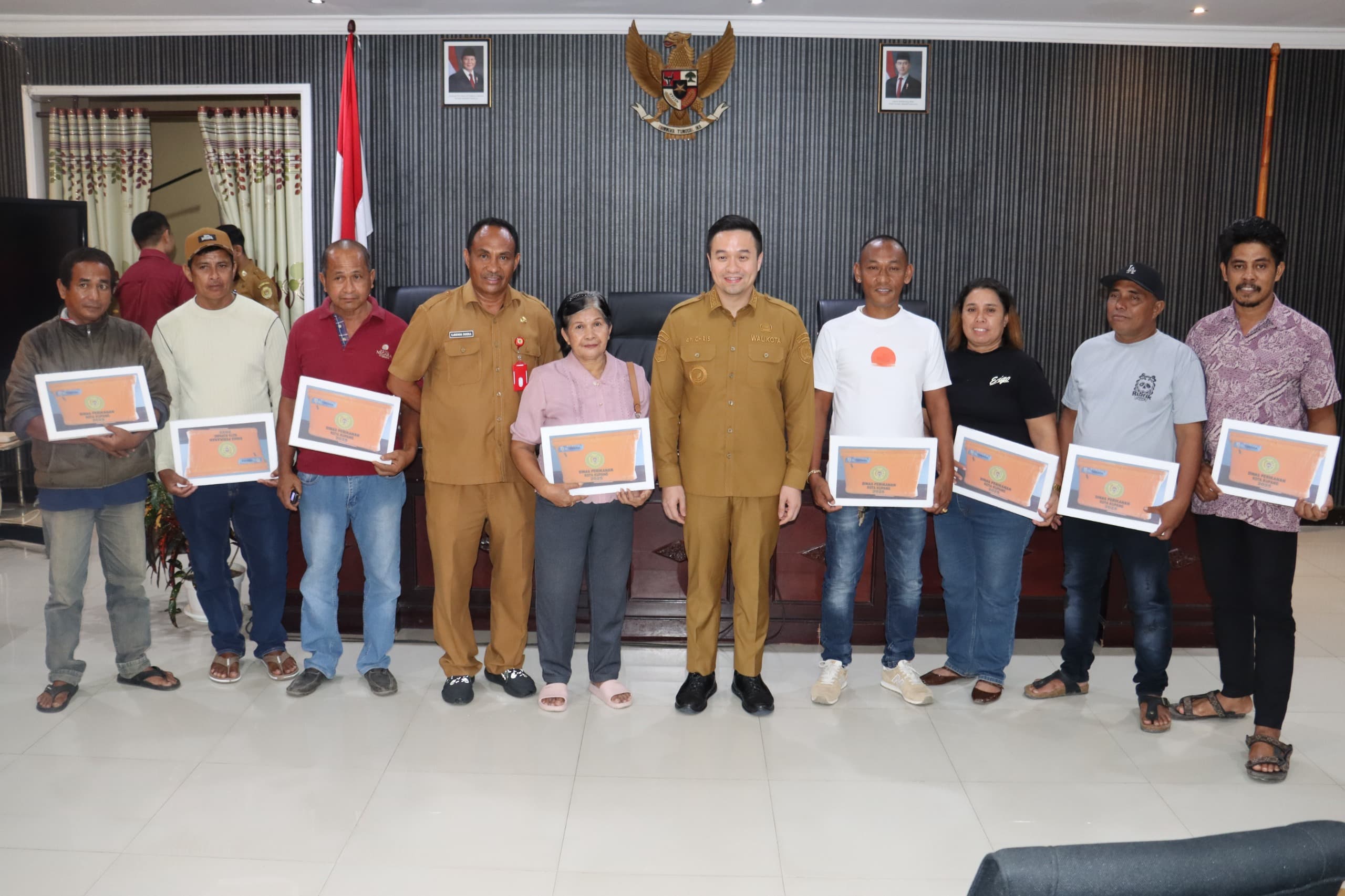 Wali Kota Kupang, dr. Christian Widodo, menyerahkan secara langsung Bantuan Sarana Prasarana Pendukung Perikanan berupa coolbox kepada para pelaku usaha perikanan dalam kegiatan yang berlangsung di Ruang Rapat Garuda, Selasa (2/12). Turut hadir Kepala Dinas Perikanan Kota Kupang, Ejbends H. D. S. Doeka, S.Sos., beserta jajaran, serta 10 penerima bantuan coolbox.