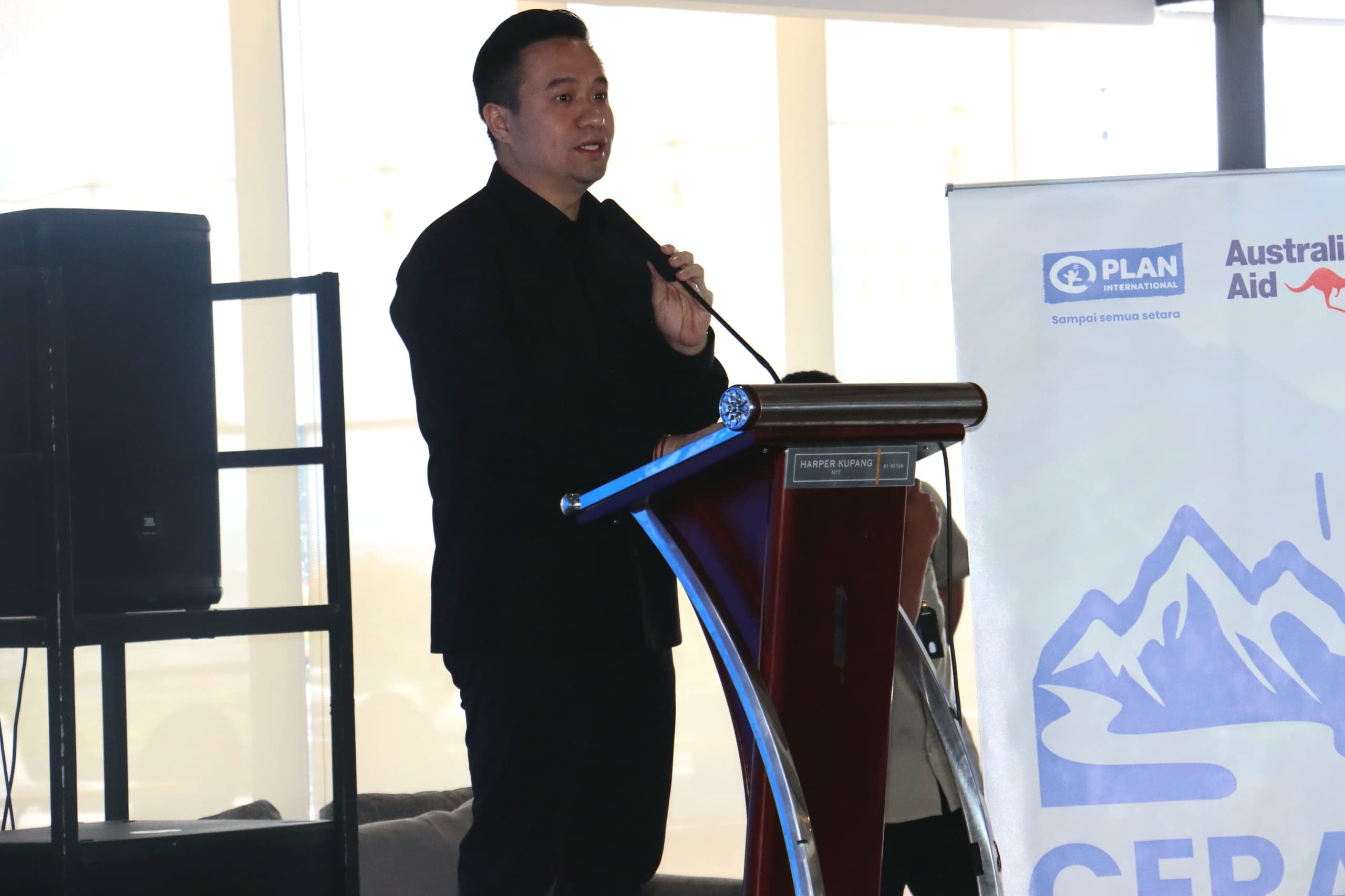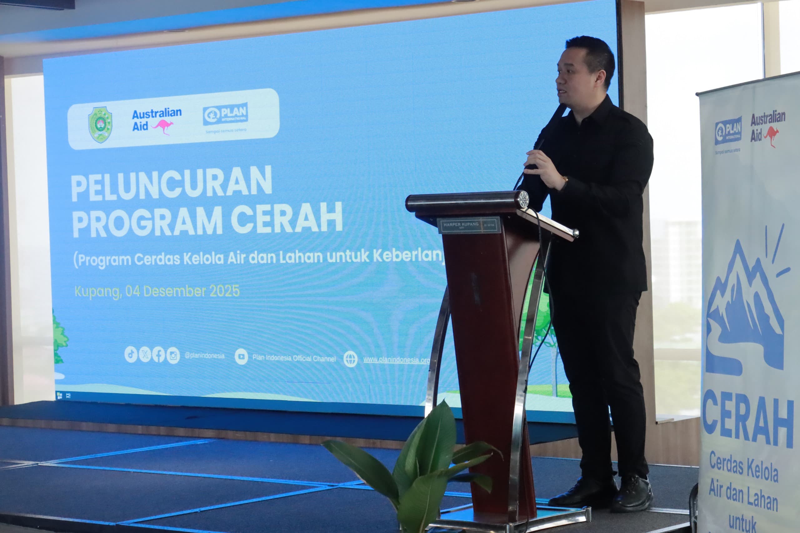 Wali Kota Kupang, dr. Christian Widodo, meluncurkan Program CERAH (Cerdas Kelola Air dan Lahan untuk Keberlanjutan) bekerja sama dengan PLAN Indonesia yang berlangsung di Hotel Harper Kupang, Kamis, (4/12). Acara tersebut dihadiri Area Program Manager Yayasan PLAN International Indonesia, Samuel Absalom Niap beserta jajaran, Ketua Tim Penggerak PKK Kota Kupang, dr. Widya Cahya, Ketua Dharma Wanita Persatuan Kota Kupang, para Asisten Sekretaris Daerah Kota Kupang, para Kepala Perangkat Daerah Pemerintah Kota Kupang, Direktur Perumda Air Minum Kota Kupang, tokoh adat Helong, tokoh agama, akademisi, kaum muda, perempuan serta komunitas disabilitas.