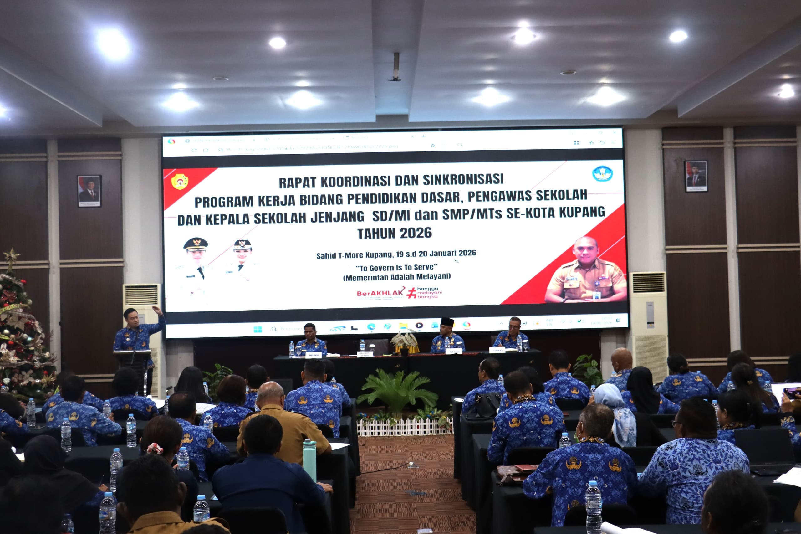 Wali Kota Kupang, dr. Christian Widodo, menghadiri Rapat Koordinasi dan Sinkronisasi Program Kerja Bidang Pendidikan Dasar bersama Pengawas Sekolah dan Kepala Sekolah Jenjang SD dan SMP/MTs se-Kota Kupang Tahun 2026, yang berlangsung di Hotel Sahid T-More, Senin (19/01).