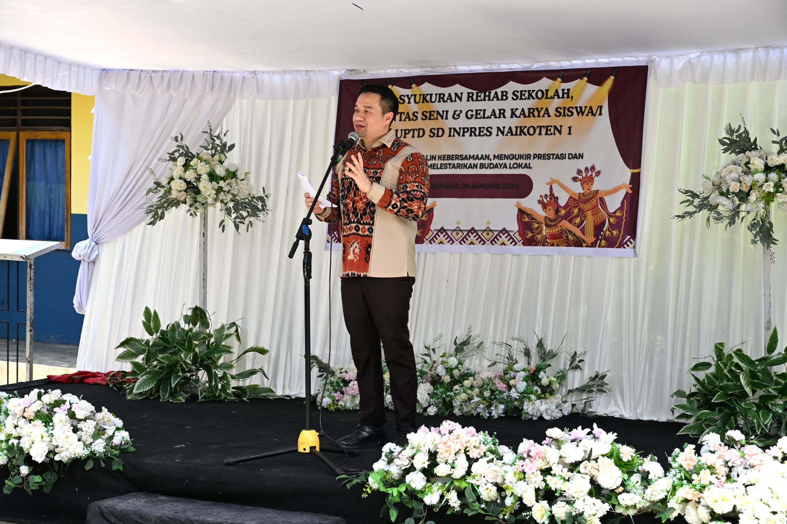 Wali Kota Kupang, dr. Christian Widodo, menghadiri acara Syukuran Rehabilitasi Gedung Sekolah dan Pentas Seni yang digelar di Lapangan UPTD SD Inpres Naikoten 1, Sabtu (24/01). Kegiatan tersebut dirangkaikan dengan pentas seni siswa sebagai ungkapan syukur atas selesainya rehabilitasi sarana dan prasarana sekolah.