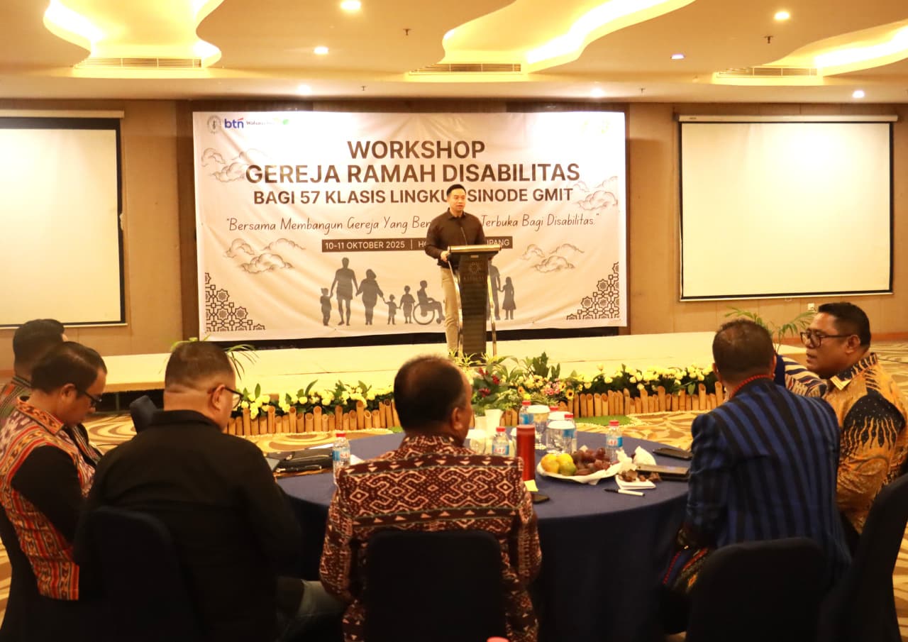 Wali Kota Kupang, dr. Christian Widodo, menyampaikan apresiasi dan rasa bangga atas terselenggaranya Workshop Gereja Ramah Disabilitas bagi 57 Klasis se-GMIT yang berlangsung di Hotel Kristal Kupang, Sabtu (11/10). Hadir pada kegiatan tersebut Bupati Kupang, Yosef Lede, Anggota DPRD Provinsi NTT, Winston Neil Rondo, Staf Ahli Gubernur NTT Bidang Kesejahteraan Rakyat, Ady Endezon Mandala, M.Si, Ketua Sinode GMIT, Pdt. Samuel Benyamin Pandie, S.Th., Kepala Dinas Sosial Kota Kupang, Yohanes D.B.B.K. Assan, S.Kom., Ketua Panitia Workshop Gereja Ramah Disabilitas, Wildrian Ronald Otta, S.STP., M.M., komunitas disabilitas, serta para peserta dari 57 klasis GMIT.